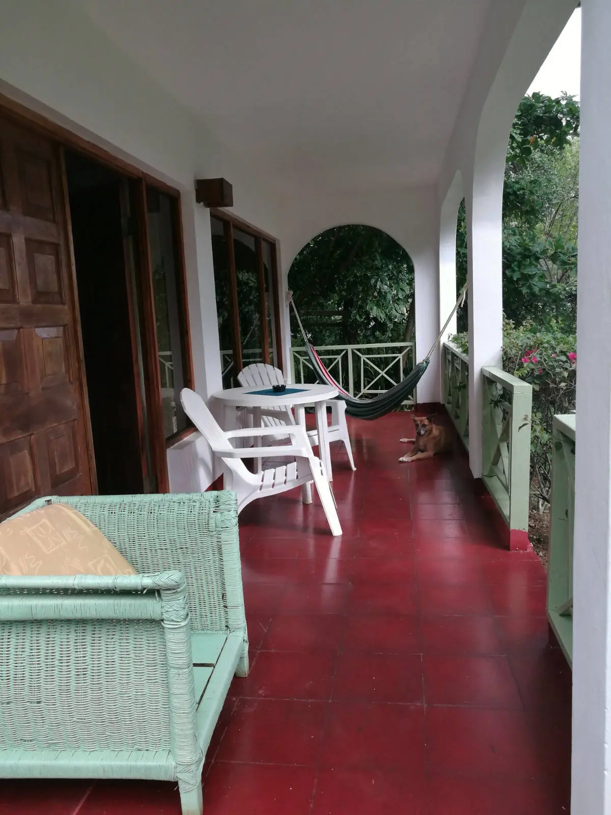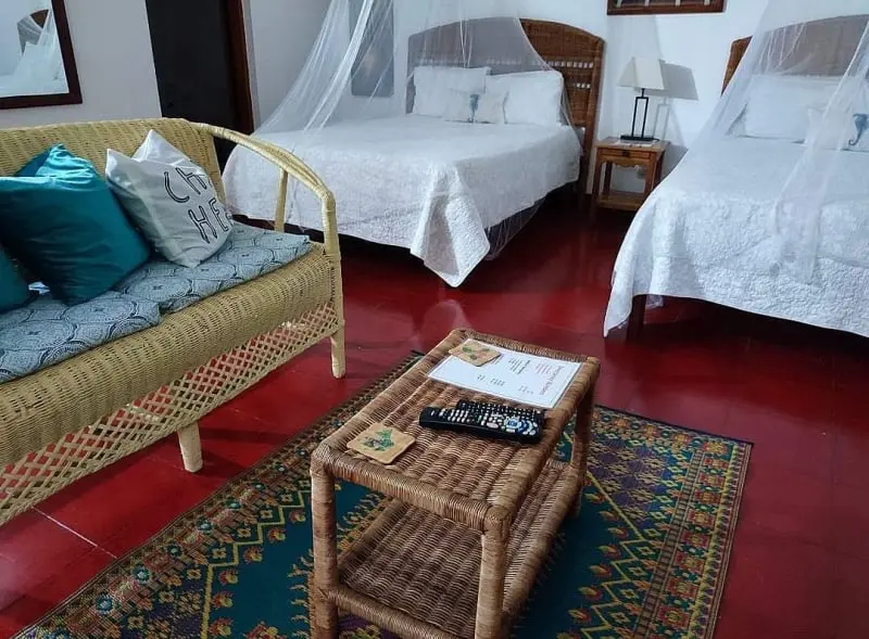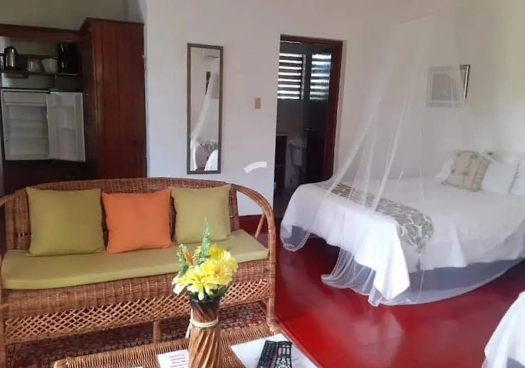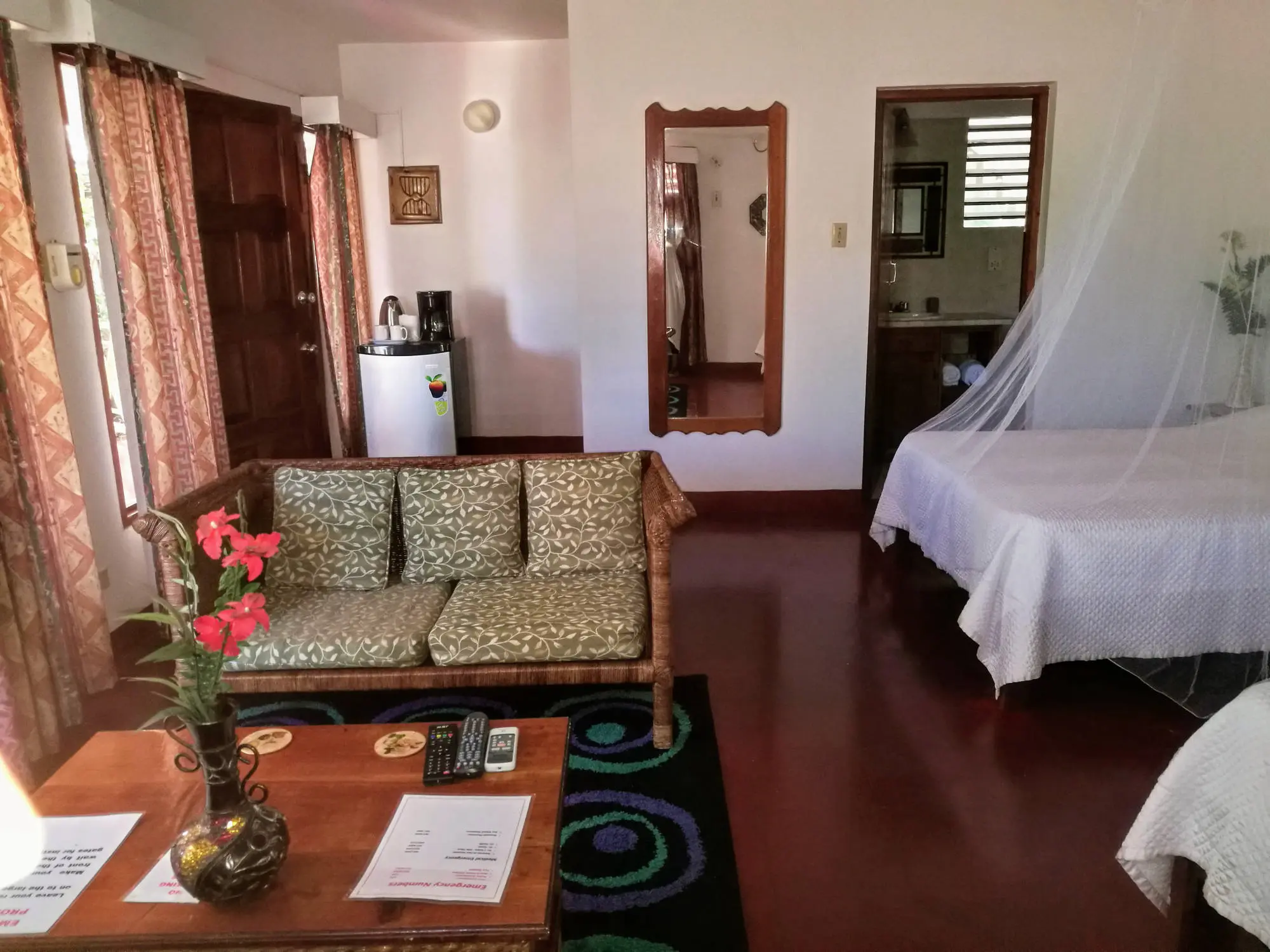 Room Descriptions: We have ten rooms, all are equipped with Refrigerator, Coffee maker and Kettle, five of which are fully Air Conditioned, with two double beds, Hot and Cold Water, while four are Fan only: both ceiling and standing fan. Included in our ten rooms is one Kitchenette: the Jasmine villa Upstairs. The Jasmine Villa Upstairs en tales, a Queen bed; Stove Top; Microwave and Toaster. Then there is the Bella villa Upstairs, known as the two Bedroom Apartment, furnished with one Double bed in each room, along with the other amenities. All our rooms have Garden View Balcony with comfortable Hammocks.