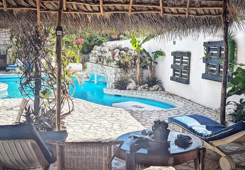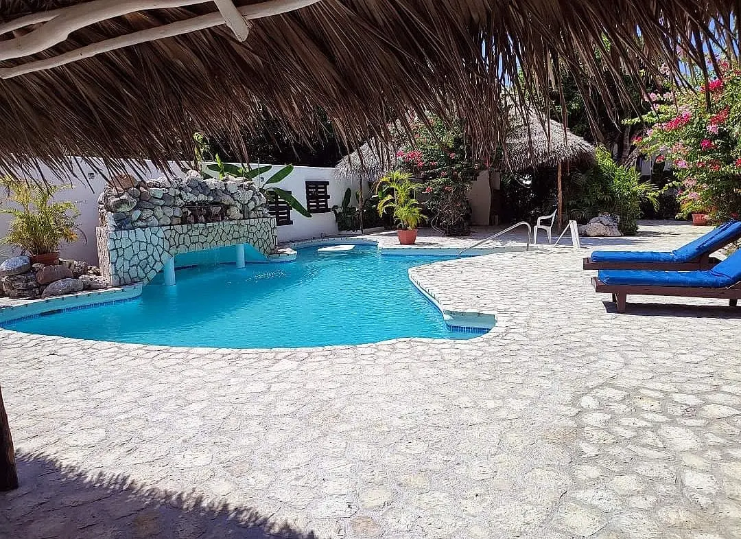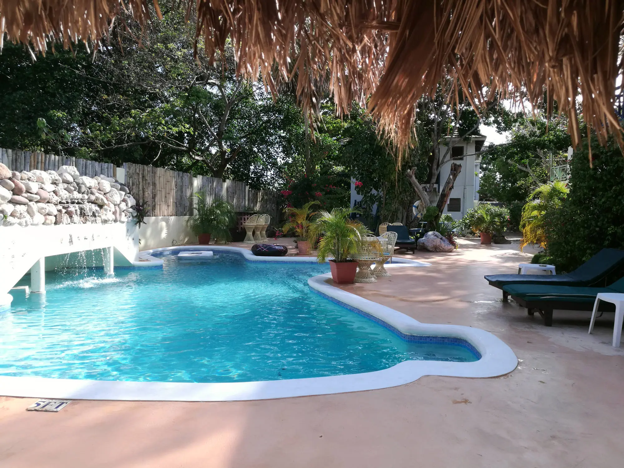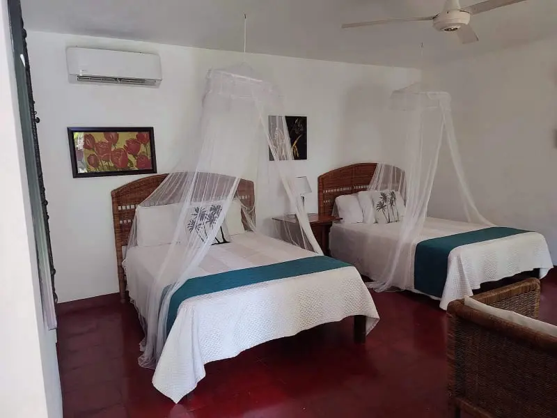 Room Descriptions: We have ten rooms, all are equipped with Refrigerator, Coffee maker and Kettle, five of which are fully Air Conditioned, with two double beds, Hot and Cold Water, while four are Fan only: both ceiling and standing fan. Included in our ten rooms is one Kitchenette: the Jasmine villa Upstairs. The Jasmine Villa Upstairs en tales, a Queen bed; Stove Top; Microwave and Toaster. Then there is the Bella villa Upstairs, known as the two Bedroom Apartment, furnished with one Double bed in each room, along with the other amenities. All our rooms have Garden View Balcony with comfortable Hammocks.